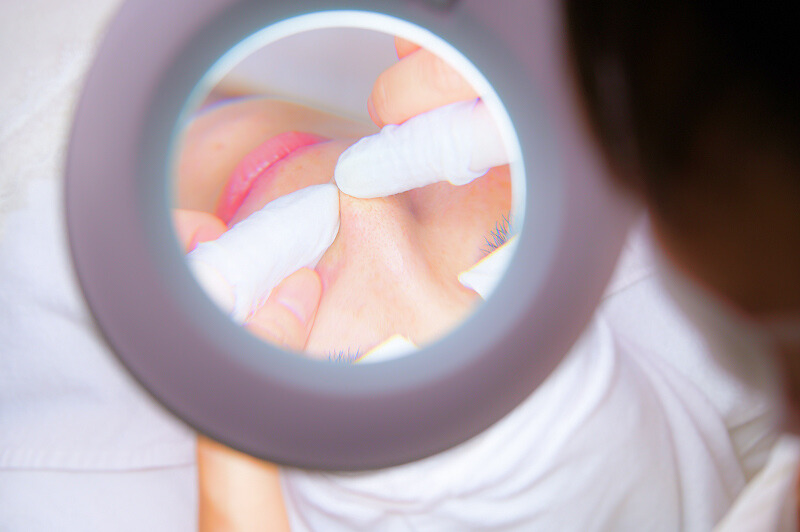拡大鏡で部位ごとにお肌の状態を確認していきます。