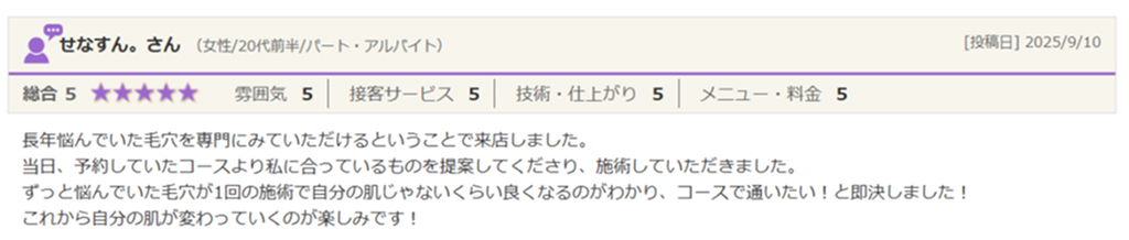 当日、予約していたコースより私に合っているものを提案してくださり、施術していただきました。ずっと悩んでいた毛穴が1回の施術で自分の肌じゃないくらい良くなるのがわかり、コースで通いたい!と即決しました!